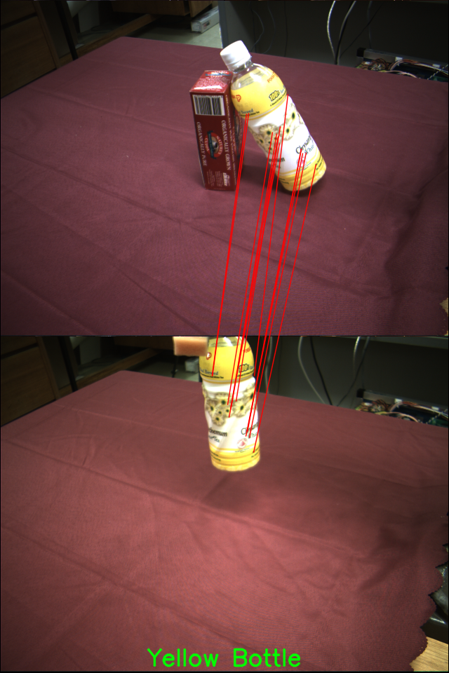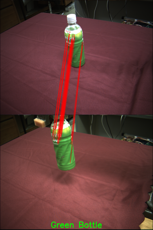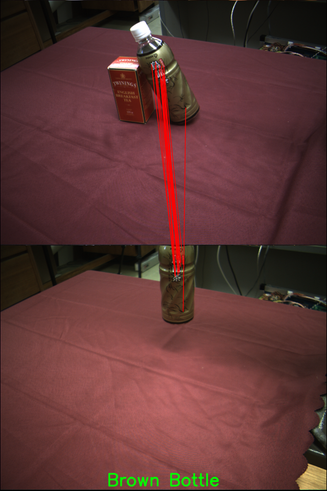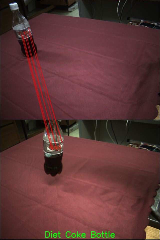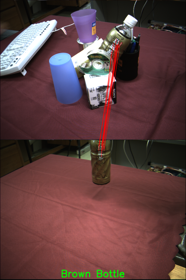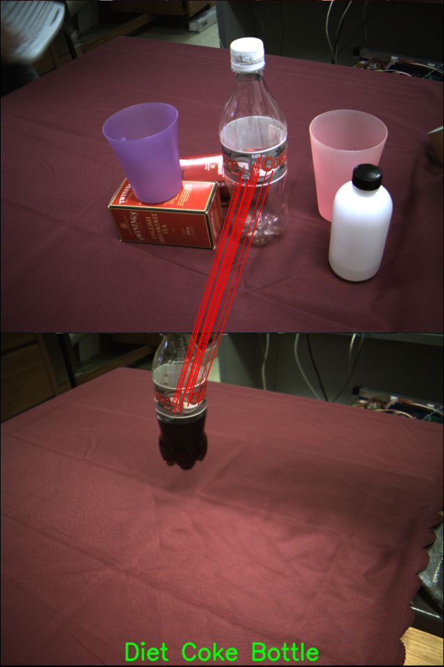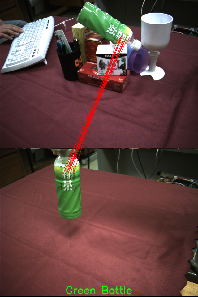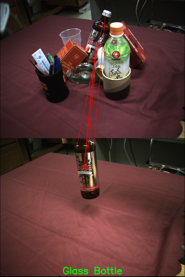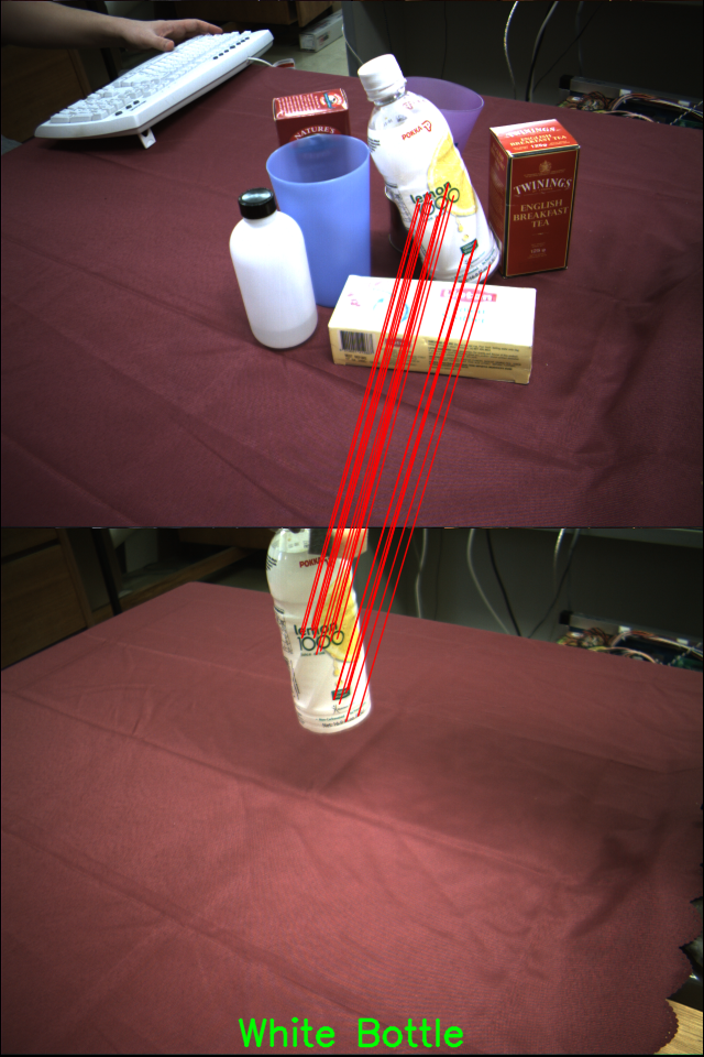 The object recognition results are organized next to the corresponding object learning video. Four test images are used for each object. The object recognition results are available via the links numbered from 00 to 03. Each result image shows the test image above the matching training image returned by the recognition system. The recognized object label is printed in green. The red lines represent the SIFT descriptor matches between the test image and the training image.