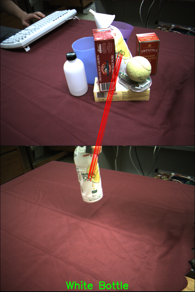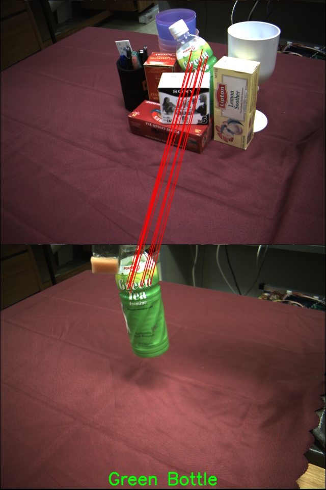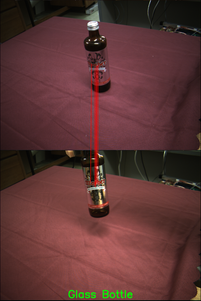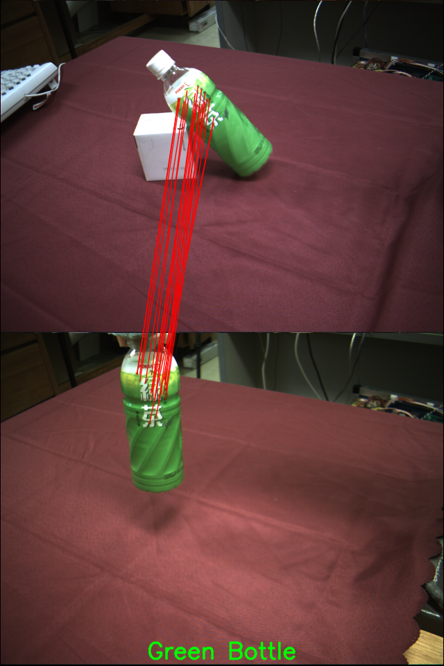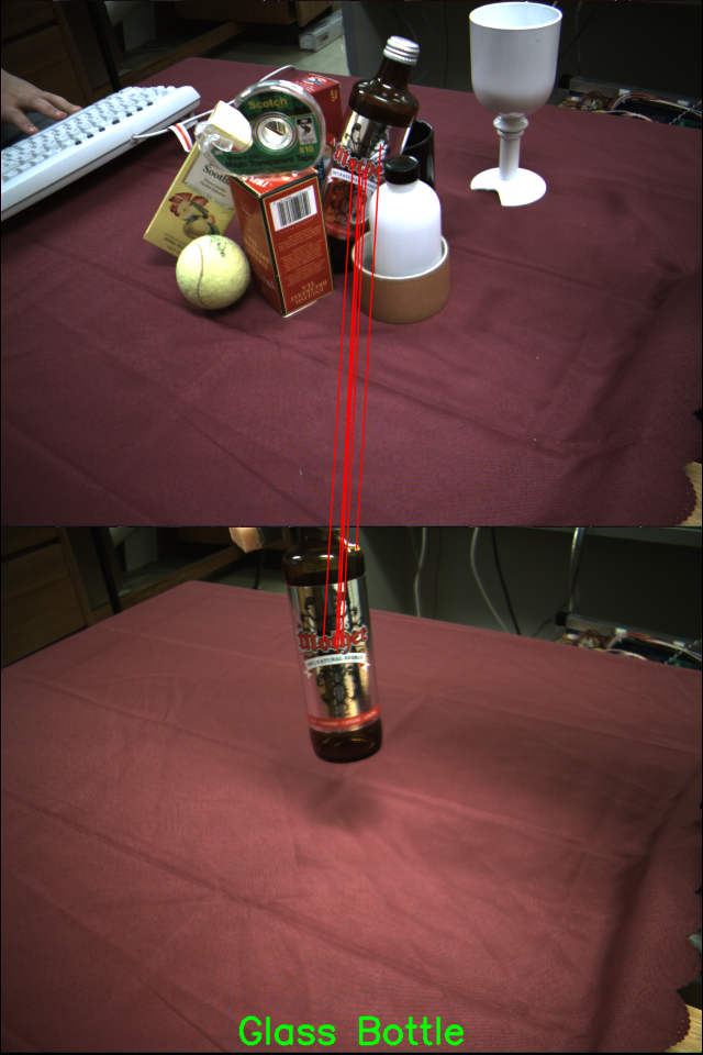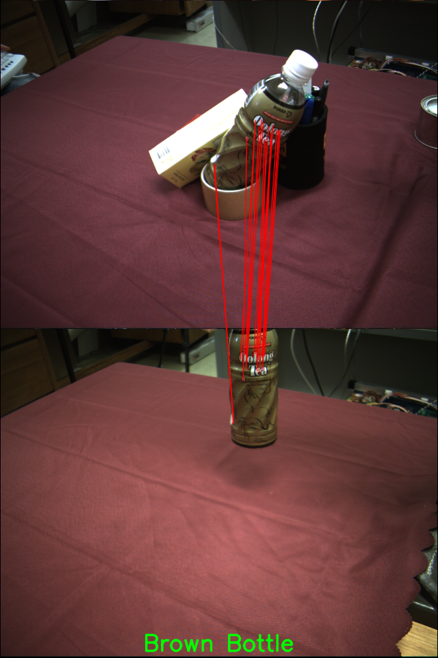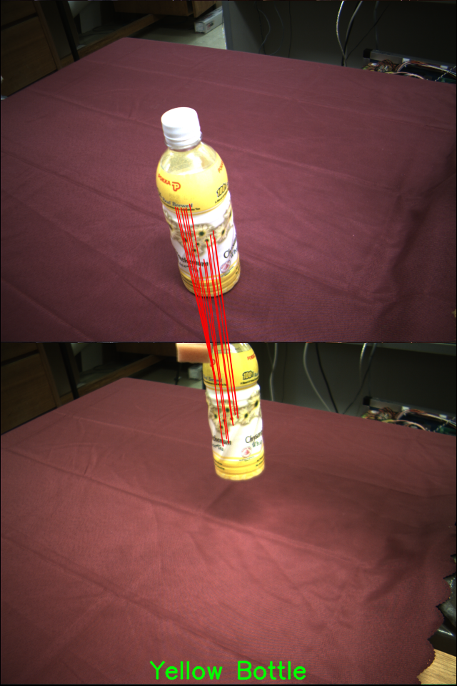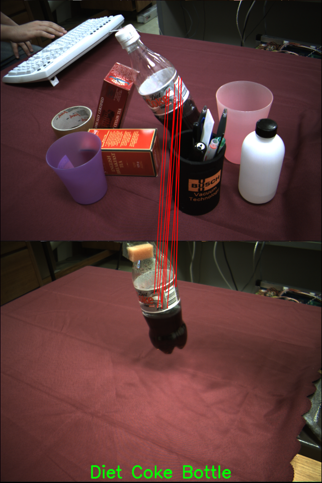 The object recognition results are organized next to the corresponding object learning video. Four test images are used for each object. The object recognition results are available via the links numbered from 00 to 03. Each result image shows the test image above the matching training image returned by the recognition system. The recognized object label is printed in green. The red lines represent the SIFT descriptor matches between the test image and the training image.