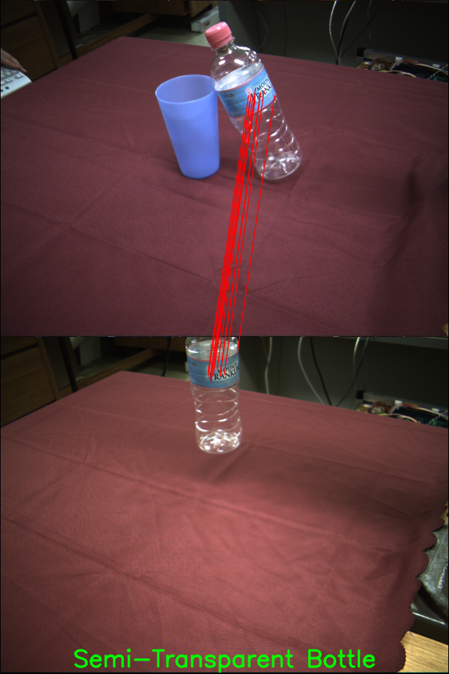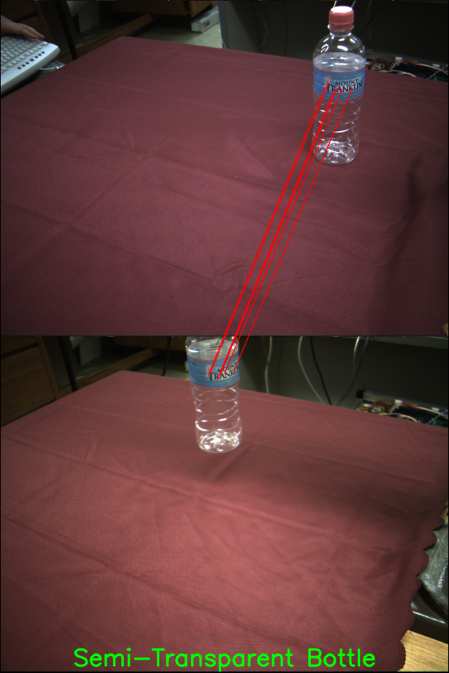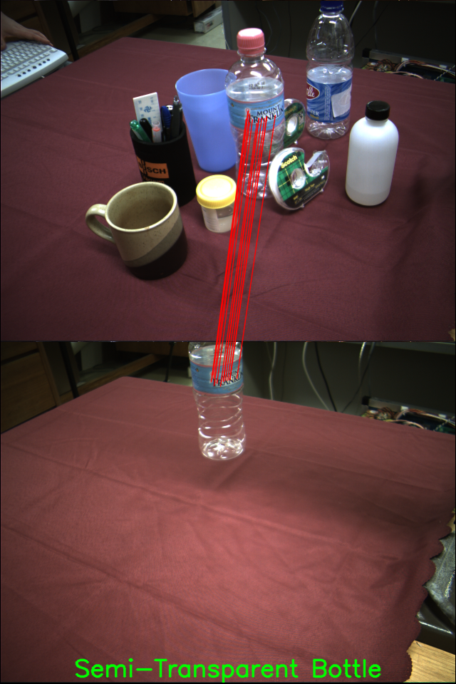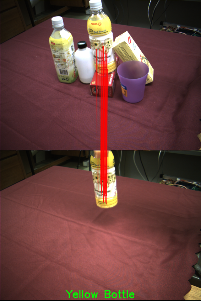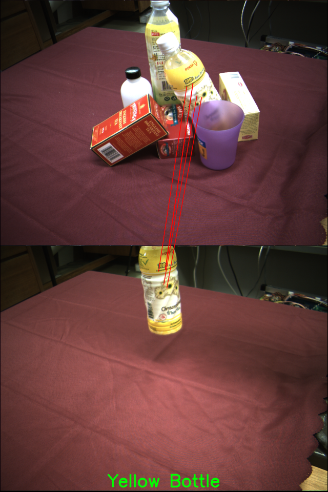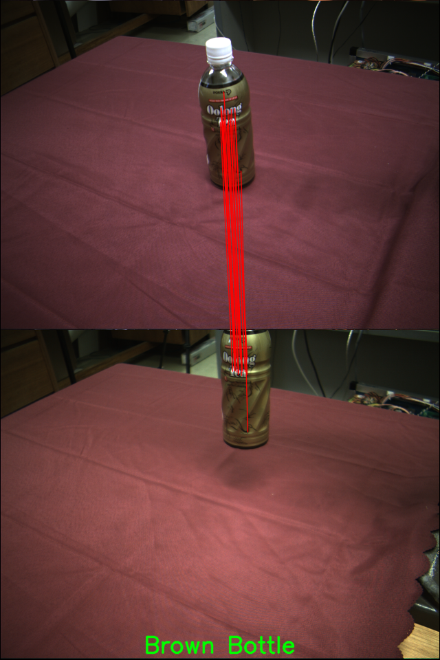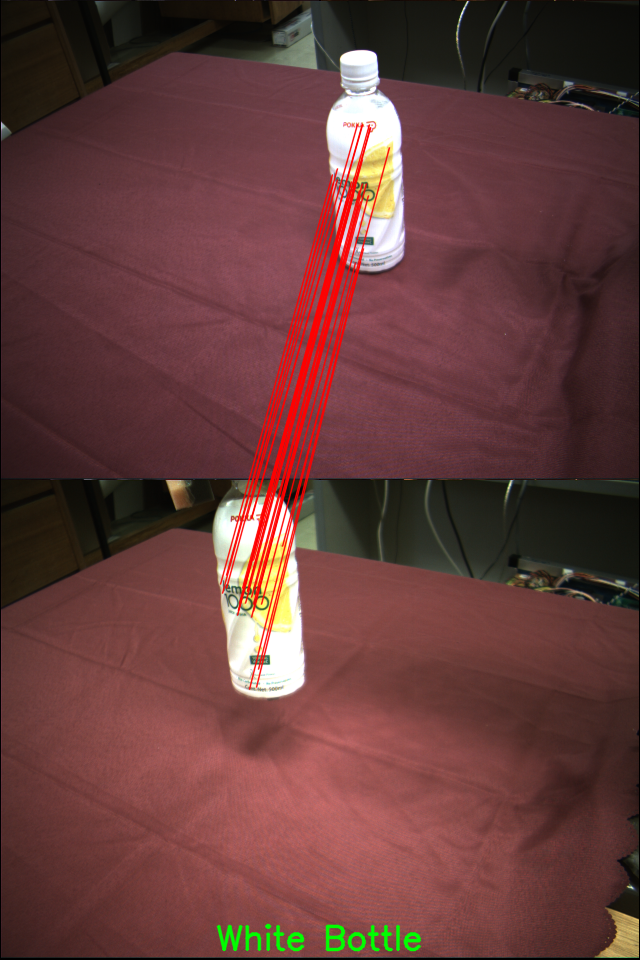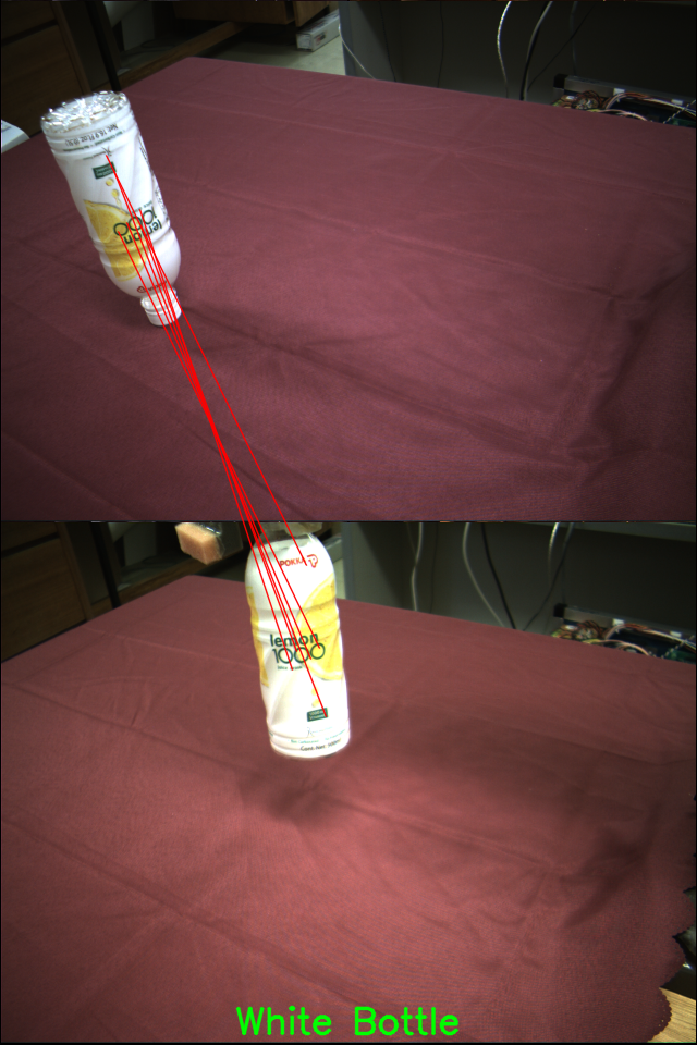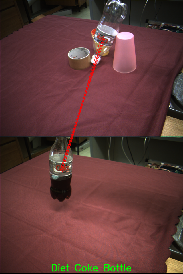 The object recognition results are organized next to the corresponding object learning video. Four test images are used for each object. The object recognition results are available via the links numbered from 00 to 03. Each result image shows the test image above the matching training image returned by the recognition system. The recognized object label is printed in green. The red lines represent the SIFT descriptor matches between the test image and the training image.